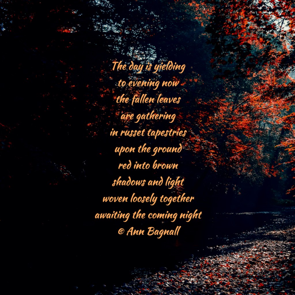 November 29, 2022November 13, 2022 The day is yielding To evening now The fallen leaves Are gathering In russet tapestries Upon the ground Red into brown Shadows and light Woven loosely together Awaiting the coming night © Ann Bagnall Share this: Click to email a link to a friend (Opens in new window) Email Tweet Click to print (Opens in new window) Print Like Loading... Related