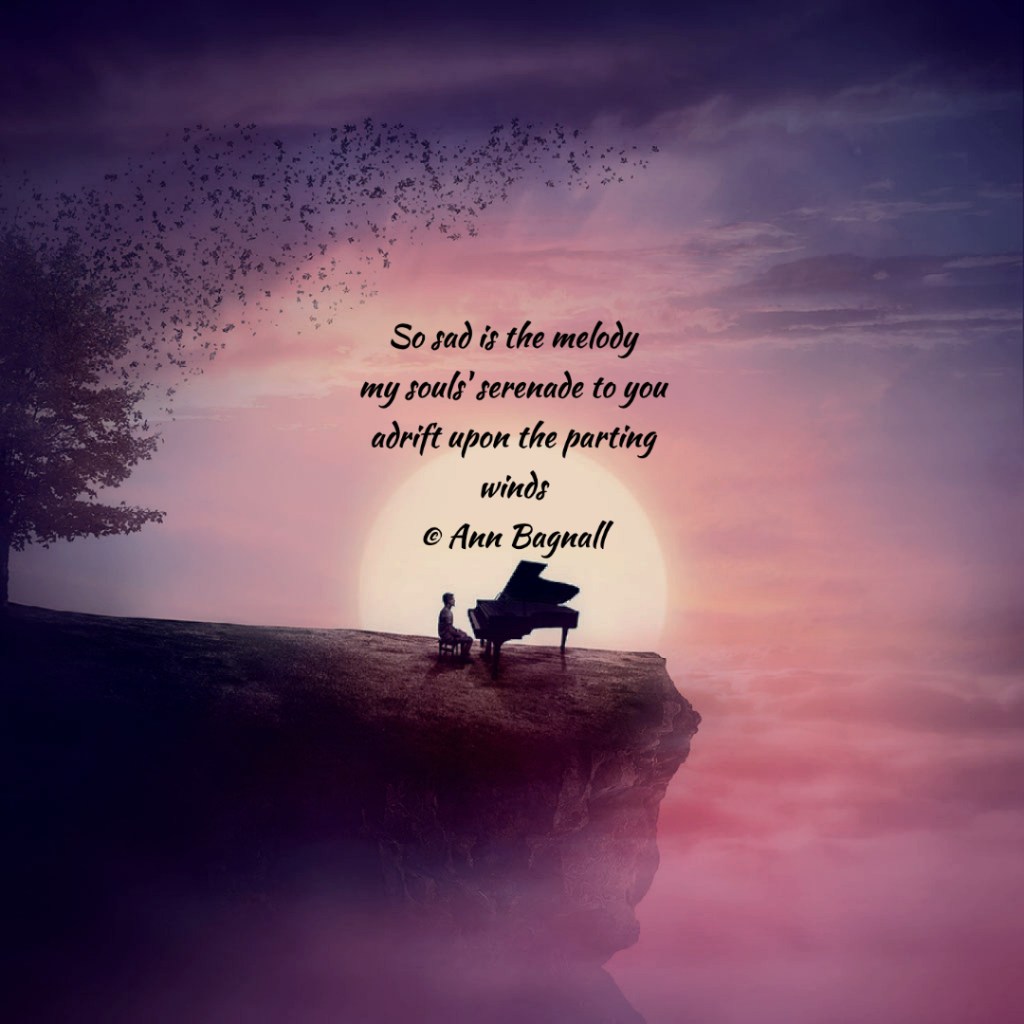 December 16, 2022November 20, 2022 So sad is the melodymy souls’ serenade to youadrift upon the parting winds © Ann Bagnall Share this: Click to email a link to a friend (Opens in new window) Email Tweet Click to print (Opens in new window) Print Like Loading... Related