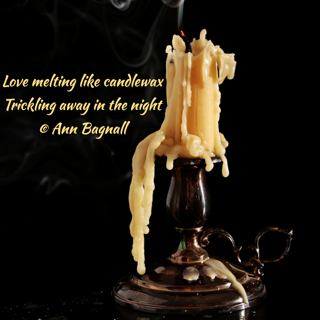 December 17, 2022November 20, 2022 Love melting like candlewaxTrickling away in the night© Ann Bagnall Share this: Click to email a link to a friend (Opens in new window) Email Tweet Click to print (Opens in new window) Print Like Loading... Related