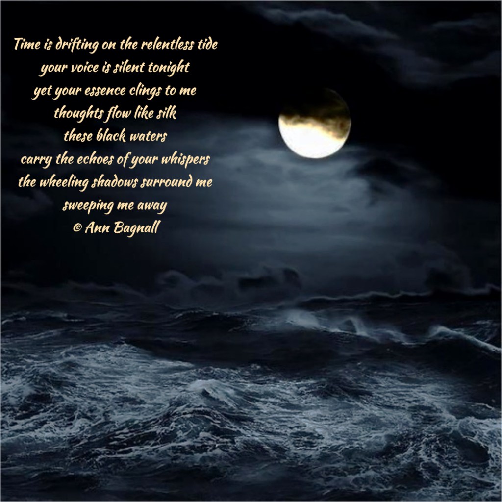 December 23, 2022November 20, 2022 Time is drifting on the relentless tideyour voice is silent tonightyet your essence clings to methoughts flow like silkthese black waterscarry the echoes of your whispersthe wheeling shadows surround mesweeping me away© Ann Bagnall Share this: Click to email a link to a friend (Opens in new window) Email Tweet Click to print (Opens in new window) Print Like Loading... Related