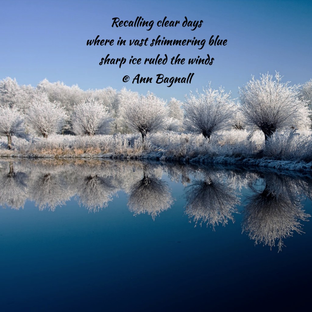December 25, 2022November 20, 2022 Recalling clear dayswhere in vast shimmering bluesharp ice ruled the winds© Ann Bagnall Share this: Click to email a link to a friend (Opens in new window) Email Tweet Click to print (Opens in new window) Print Like Loading... Related