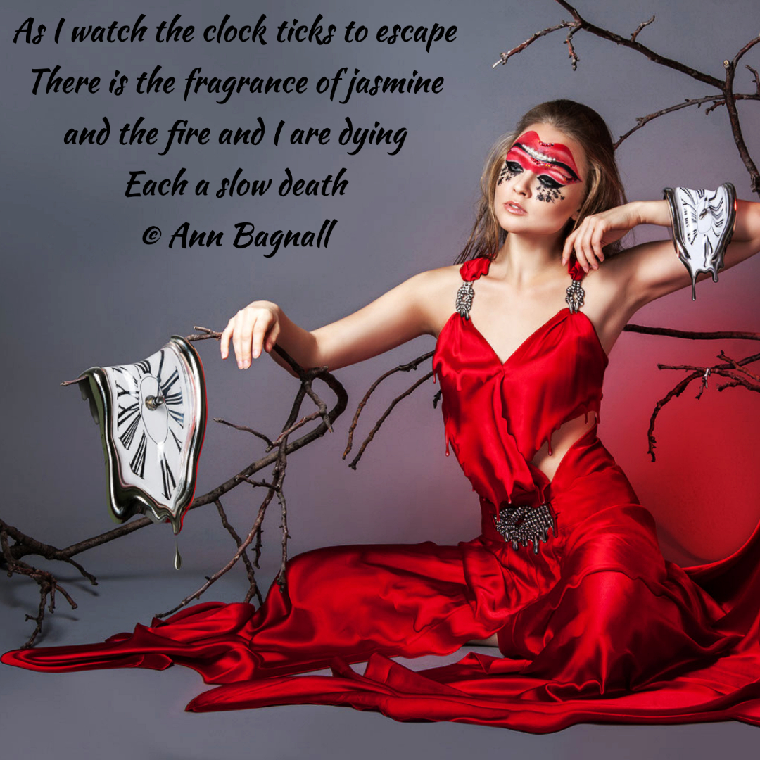 December 26, 2022November 20, 2022 As I watch the clock ticks to escape There is the fragrance of jasmine and the fire and I are dying Each a slow death © Ann Bagnall Share this: Click to email a link to a friend (Opens in new window) Email Tweet Click to print (Opens in new window) Print Like Loading... Related