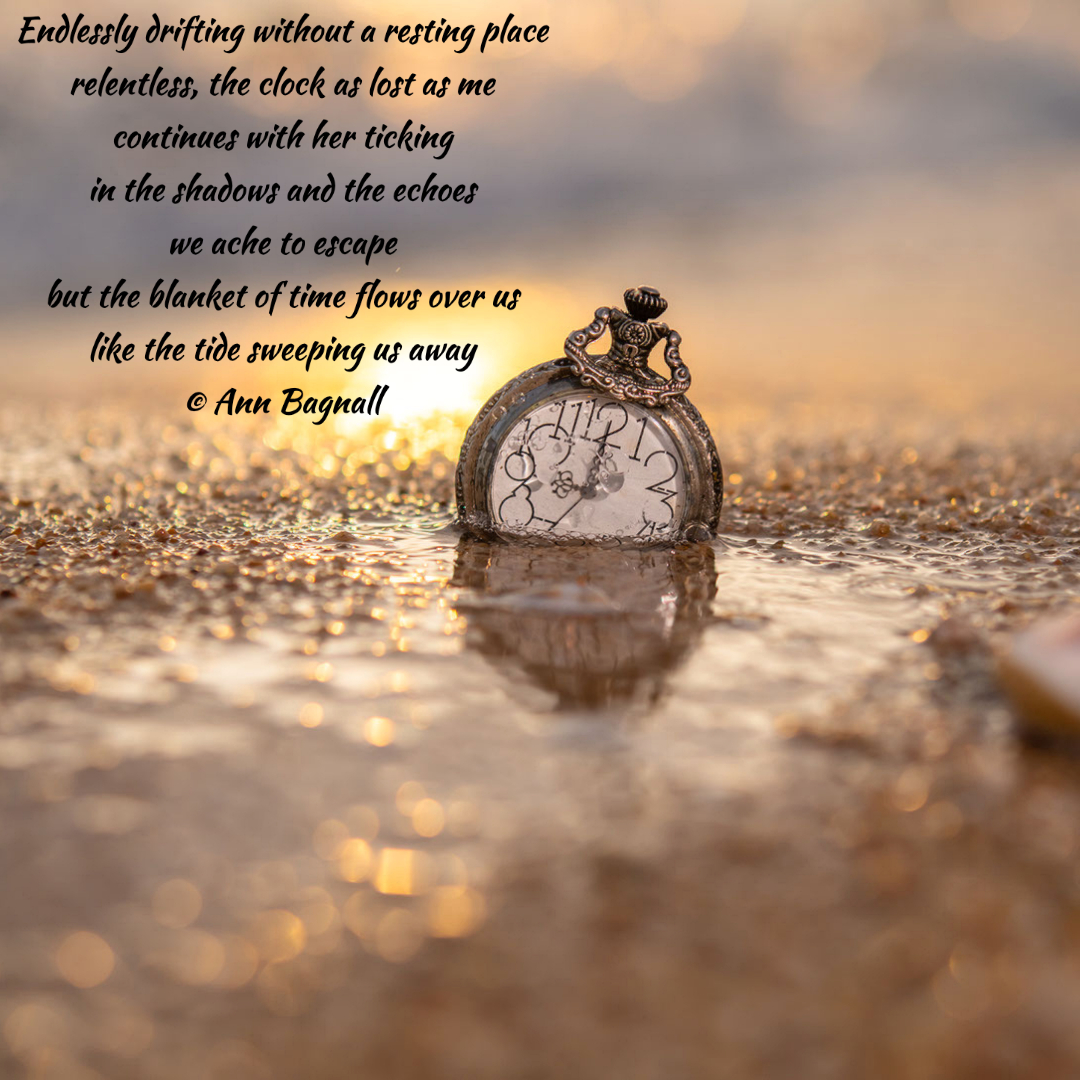 December 27, 2022November 20, 2022 Endlessly drifting without a resting place relentless, the clock as lost as me continues with her ticking in the shadows and the echoes we ache to escape but the blanket of time flows over us like the tide sweeping us away © Ann Bagnall Share this: Click to email a link to a friend (Opens in new window) Email Tweet Click to print (Opens in new window) Print Like Loading... Related