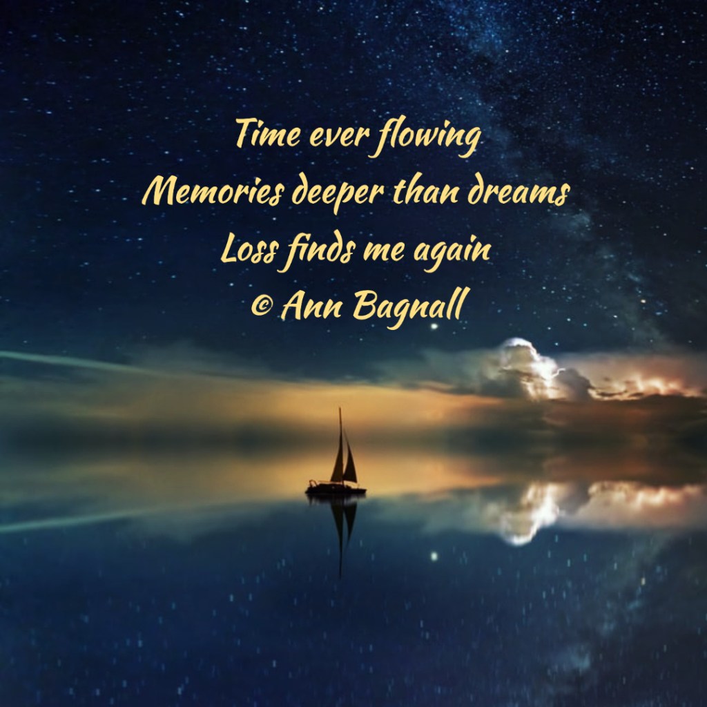 December 28, 2022November 20, 2022 Time ever flowingMemories deeper than dreamsLoss finds me again © Ann Bagnall Share this: Click to email a link to a friend (Opens in new window) Email Tweet Click to print (Opens in new window) Print Like Loading... Related