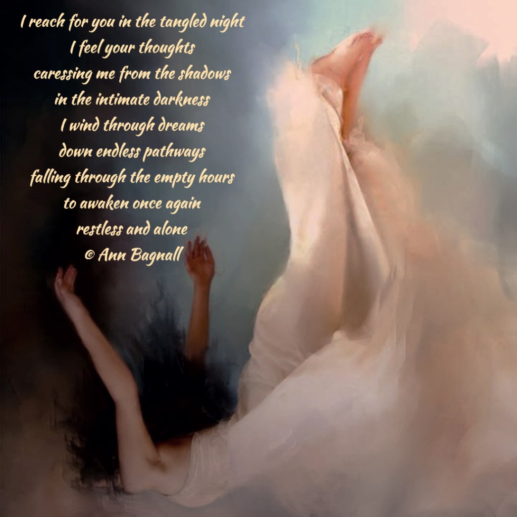 January 12, 2023October 7, 2023 I reach for you in the tangled nightI feel your thoughtscaressing me from the shadowsin the intimate darknessI wind through dreamsdown endless pathwaysfalling through the empty hoursto awaken once againrestless and alone© Ann Bagnall Share this: Click to email a link to a friend (Opens in new window) Email Tweet Click to print (Opens in new window) Print Like Loading... Related