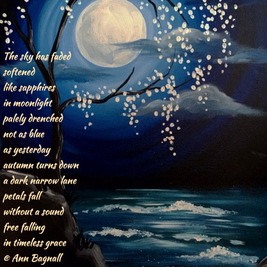 January 20, 2023December 9, 2022 The sky has faded softened like sapphires in moonlight palely drenched not as blue as yesterday autumn turns down a dark narrow lane petals fall without a sound free falling in timeless grace © Ann Bagnall Share this: Click to email a link to a friend (Opens in new window) Email Tweet Click to print (Opens in new window) Print Like Loading... Related