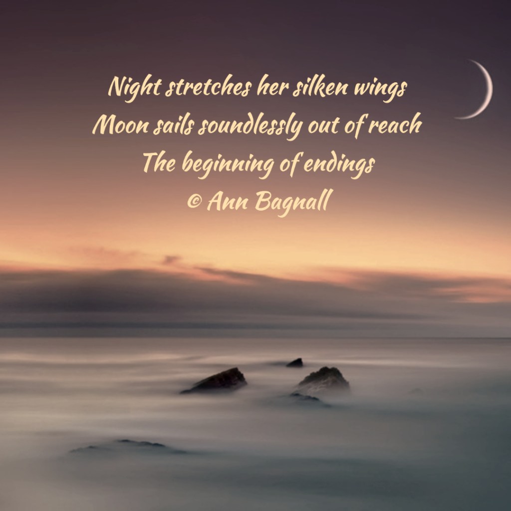 January 26, 2023December 21, 2022 Night stretches her silken wings Moon sails soundlessly out of reach The beginning of endings © Ann Bagnall Share this: Click to email a link to a friend (Opens in new window) Email Tweet Click to print (Opens in new window) Print Like Loading... Related