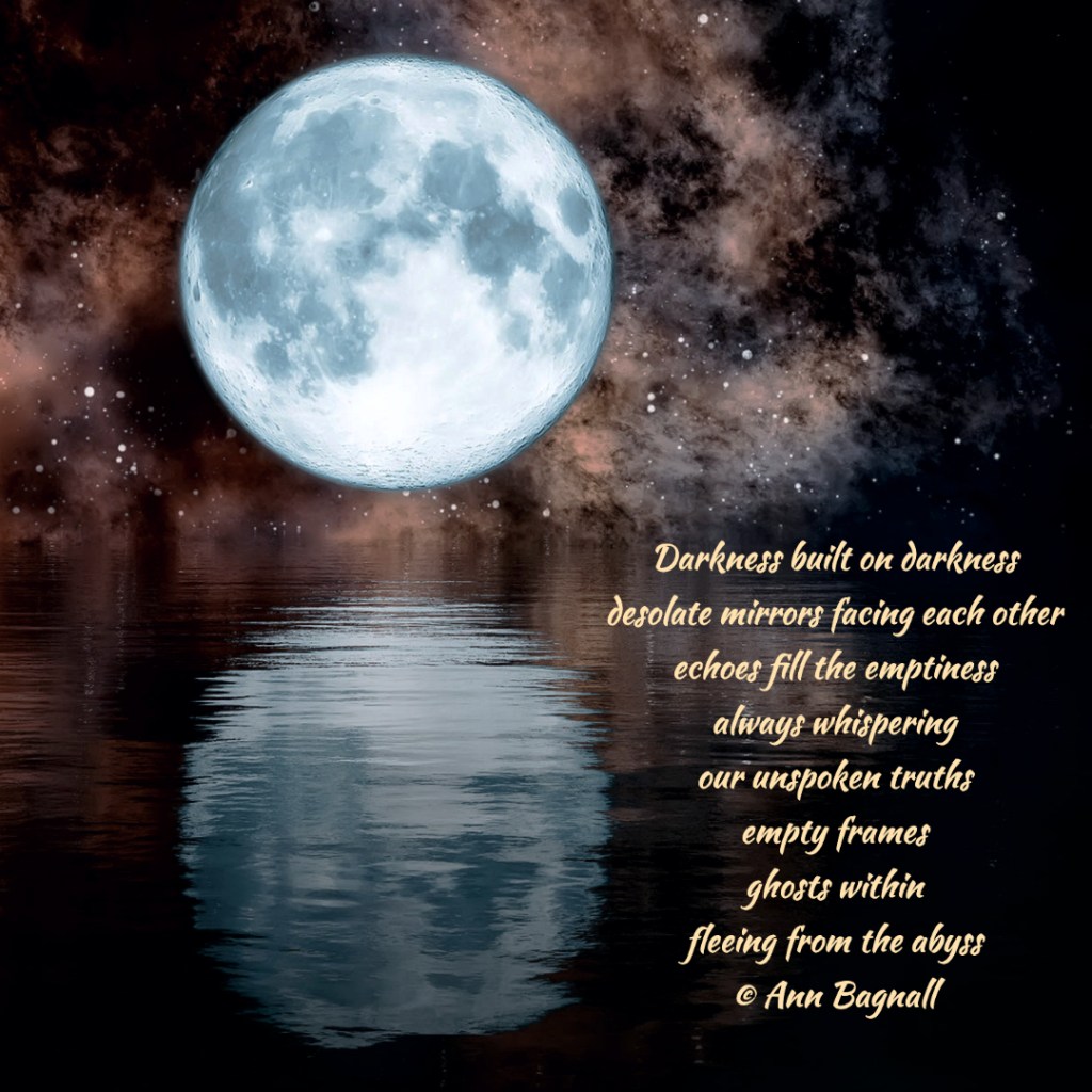 January 27, 2023December 21, 2022 Darkness built on darknessdesolate mirrors facing each otherechoes fill the emptinessalways whisperingour unspoken truthsempty framesghosts withinfleeing from the abyss© Ann Bagnall Share this: Click to email a link to a friend (Opens in new window) Email Tweet Click to print (Opens in new window) Print Like Loading... Related