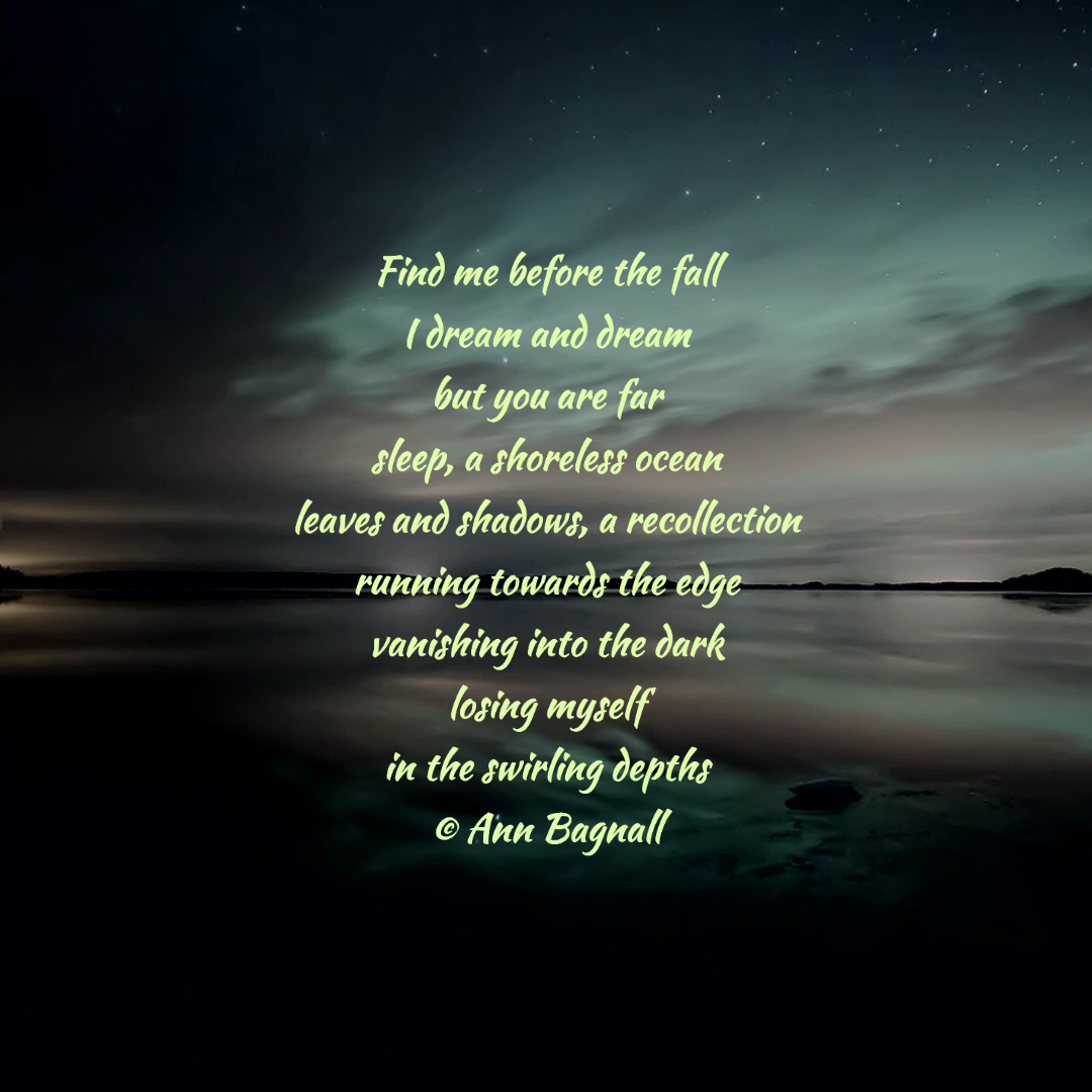 January 30, 2023December 26, 2022 Find me before the fall I dream and dream but you are far sleep, a shoreless ocean leaves and shadows, a recollection running towards the edge vanishing into the dark losing myself in the swirling depths © Ann Bagnall Share this: Click to email a link to a friend (Opens in new window) Email Tweet Click to print (Opens in new window) Print Like Loading... Related