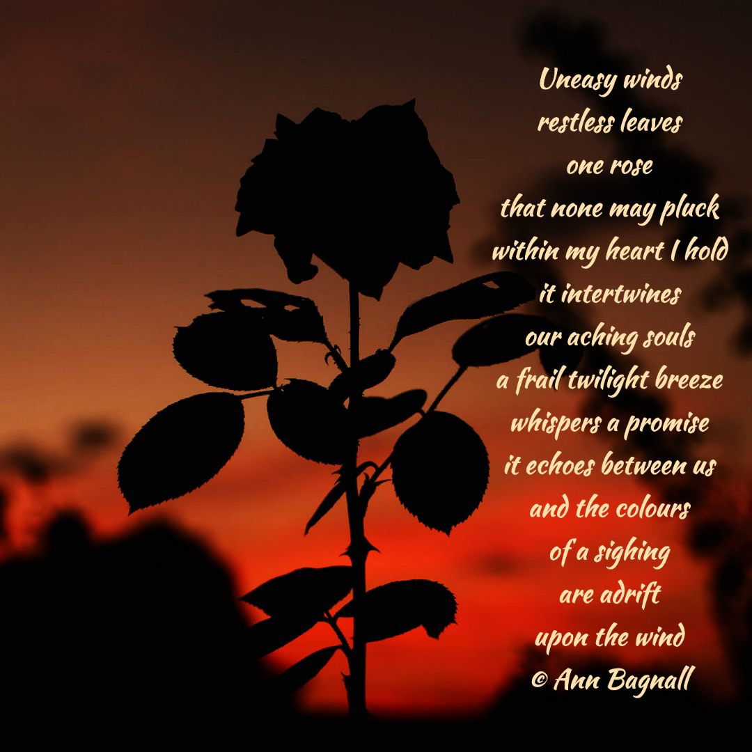 February 1, 2023December 26, 2022 Uneasy winds restless leaves one rose that none may pluck within my heart I hold it intertwines our aching souls a frail twilight breeze whispers a promise it echoes between us and the colours of a sighing are adrift upon the wind © Ann Bagnall Share this: Click to email a link to a friend (Opens in new window) Email Tweet Click to print (Opens in new window) Print Like Loading... Related