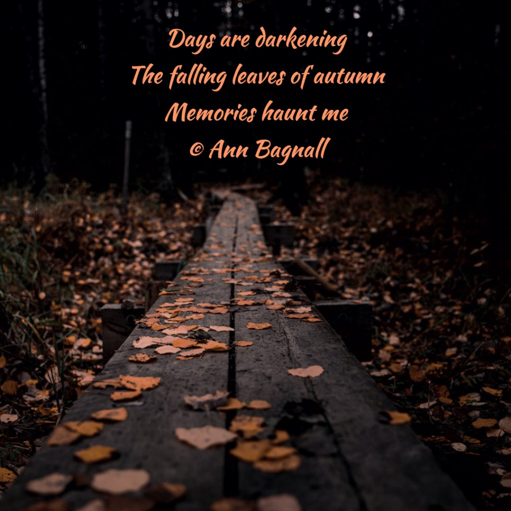 February 2, 2023January 1, 2023 Days are darkening The falling leaves of autumn Memories haunt me © Ann Bagnall Share this: Click to email a link to a friend (Opens in new window) Email Tweet Click to print (Opens in new window) Print Like Loading... Related