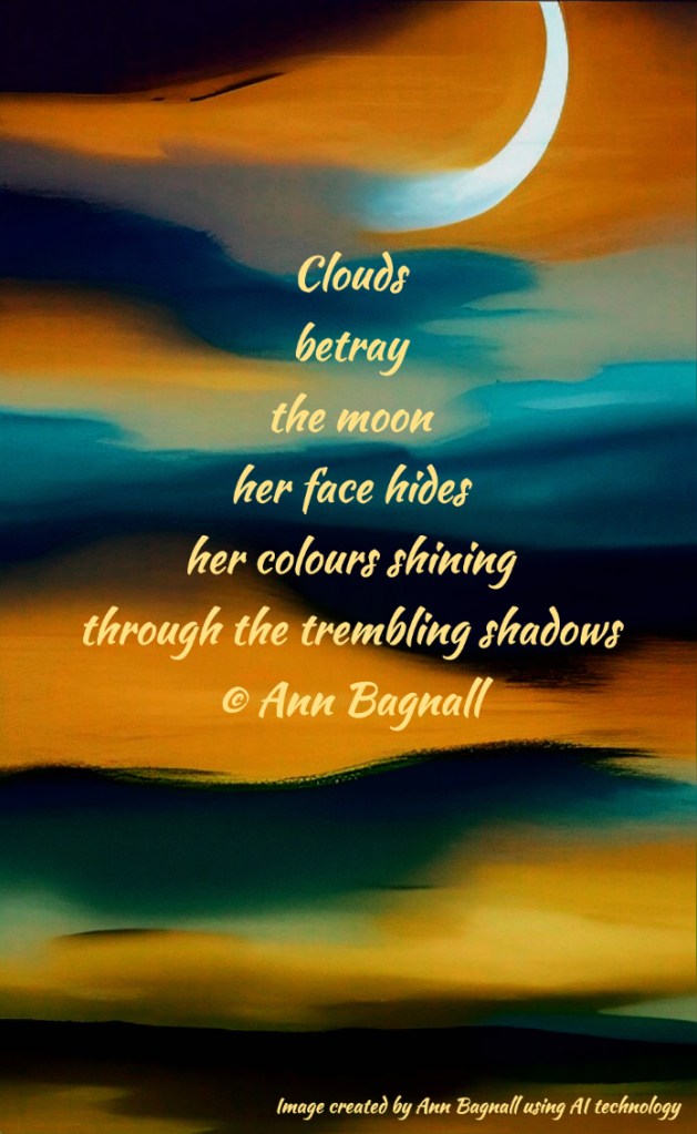 February 3, 2023January 1, 2023 Cloudsbetraythe moonher face hidesher colours shiningthrough the trembling shadows © Ann Bagnall Share this: Click to email a link to a friend (Opens in new window) Email Tweet Click to print (Opens in new window) Print Like Loading... Related