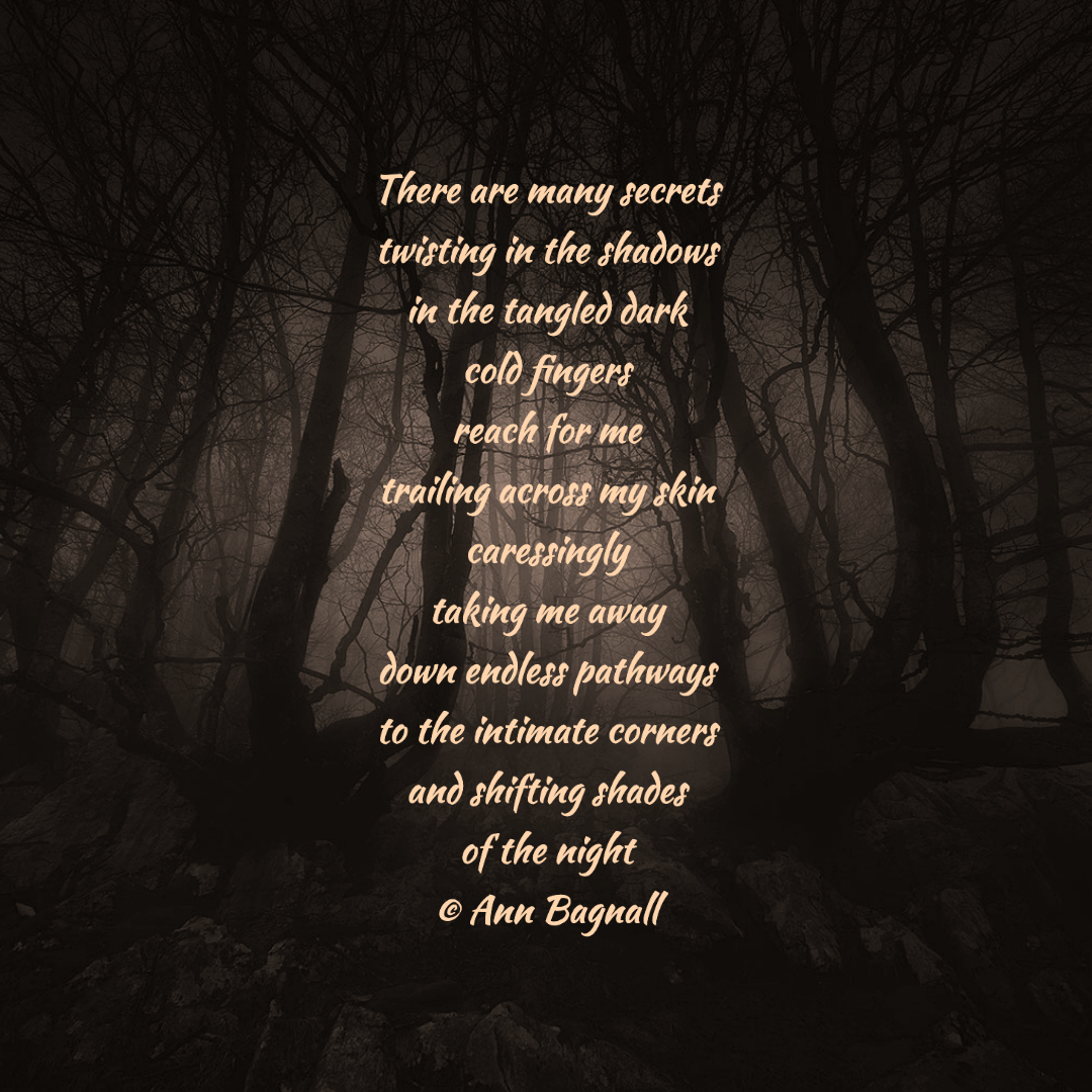 February 4, 2023January 1, 2023 There are many secretstwisting in the shadowsin the tangled darkcold fingersreach for metrailing across my skincaressingly taking me awaydown endless pathwaysto the intimate cornersand shifting shadesof the night© Ann Bagnall Share this: Click to email a link to a friend (Opens in new window) Email Tweet Click to print (Opens in new window) Print Like Loading... Related