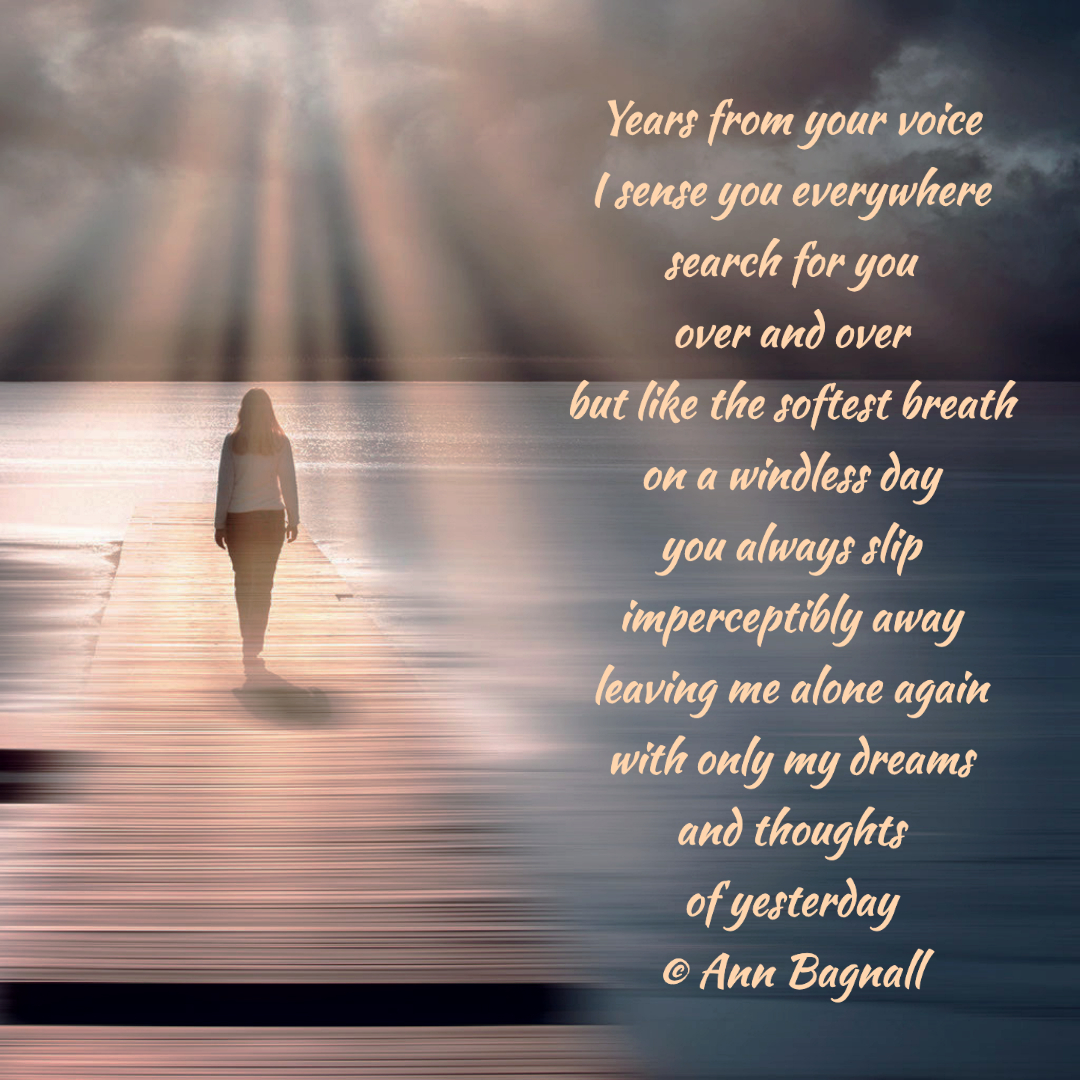 February 7, 2023January 1, 2023 Years from your voiceI sense you everywheresearch for youover and overbut like the softest breathon a windless dayyou always slipimperceptibly awayleaving me alone againwith only my dreamsand thoughtsof yesterday© Ann Bagnall Share this: Click to email a link to a friend (Opens in new window) Email Tweet Click to print (Opens in new window) Print Like Loading... Related