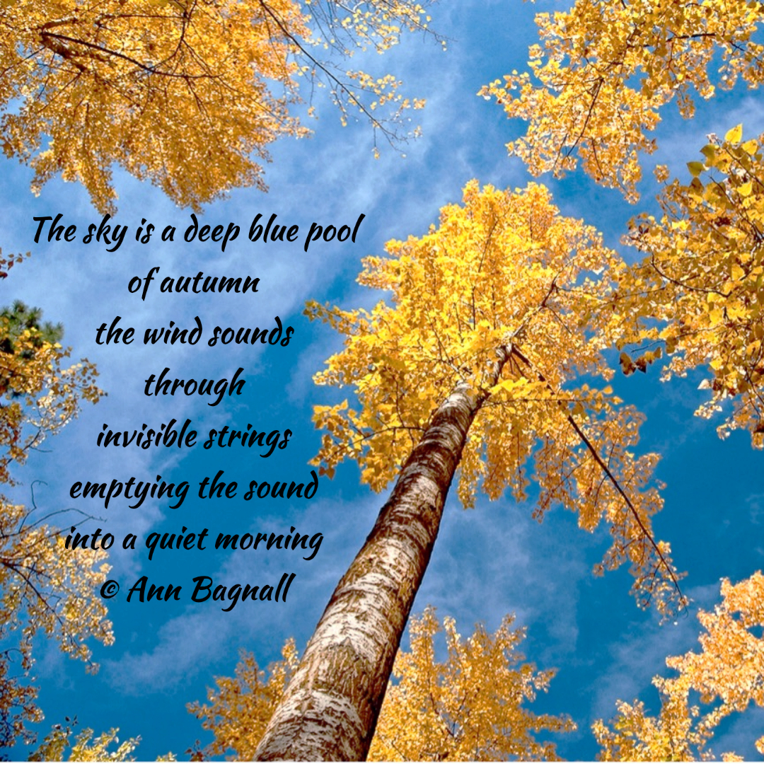 February 20, 2023February 4, 2023 The sky is a deep blue pool of autumn the wind sounds through invisible strings emptying the sound into a quiet morning © Ann Bagnall Share this: Click to email a link to a friend (Opens in new window) Email Tweet Click to print (Opens in new window) Print Like Loading... Related