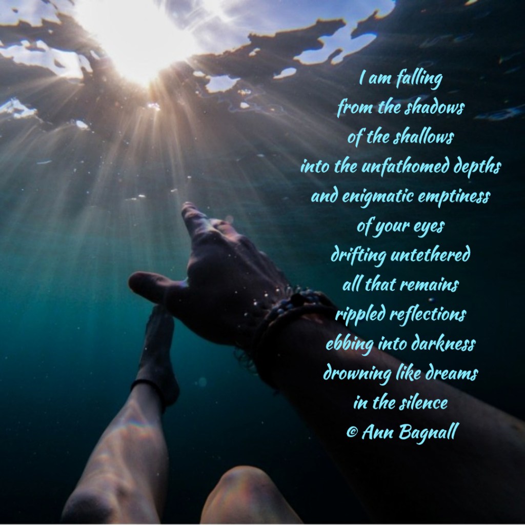 February 21, 2023February 4, 2023 I am falling from the shadows of the shallows into the unfathomed depths and enigmatic emptiness of your eyes drifting untethered all that remains rippled reflections ebbing into darkness drowning like dreams in the silence © Ann Bagnall Share this: Click to email a link to a friend (Opens in new window) Email Tweet Click to print (Opens in new window) Print Like Loading... Related