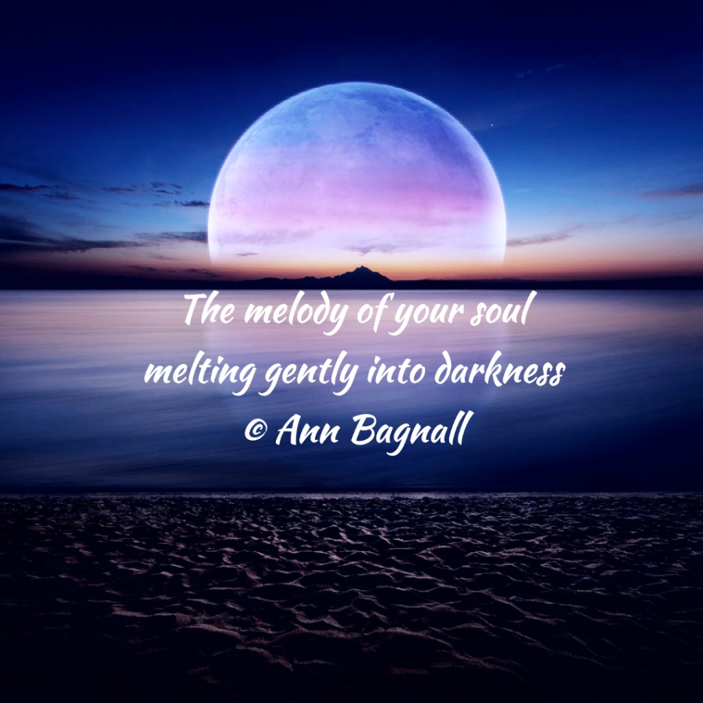 February 22, 2023February 4, 2023 The melody of your soulmelting gently into darkness© Ann Bagnall Share this: Click to email a link to a friend (Opens in new window) Email Tweet Click to print (Opens in new window) Print Like Loading... Related
