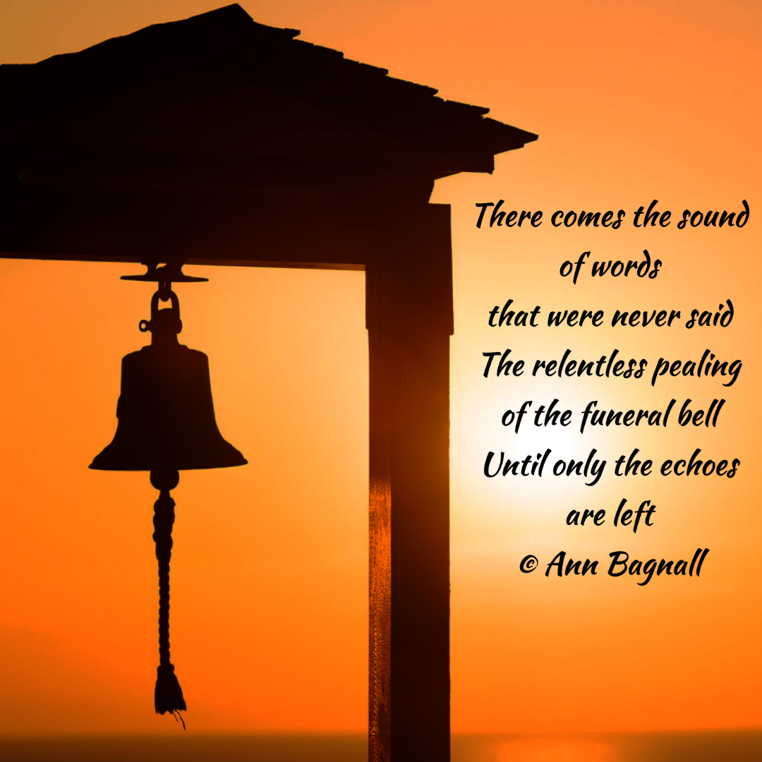 February 26, 2023February 4, 2023 There comes the soundof wordsthat were never saidThe relentless pealingof the funeral bellUntil only the echoesare left© Ann Bagnall Share this: Email a link to a friend (Opens in new window) Email Tweet Print (Opens in new window) Print Like Loading... Related