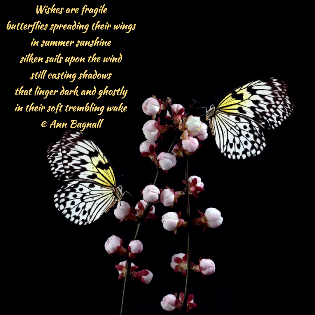 March 4, 2023February 6, 2023 Wishes are fragilebutterflies spreading their wingsin summer sunshinesilken sails upon the windstill casting shadowsthat linger dark and ghostlyin their soft trembling wake© Ann Bagnall Share this: Email a link to a friend (Opens in new window) Email Tweet Print (Opens in new window) Print Like Loading... Related