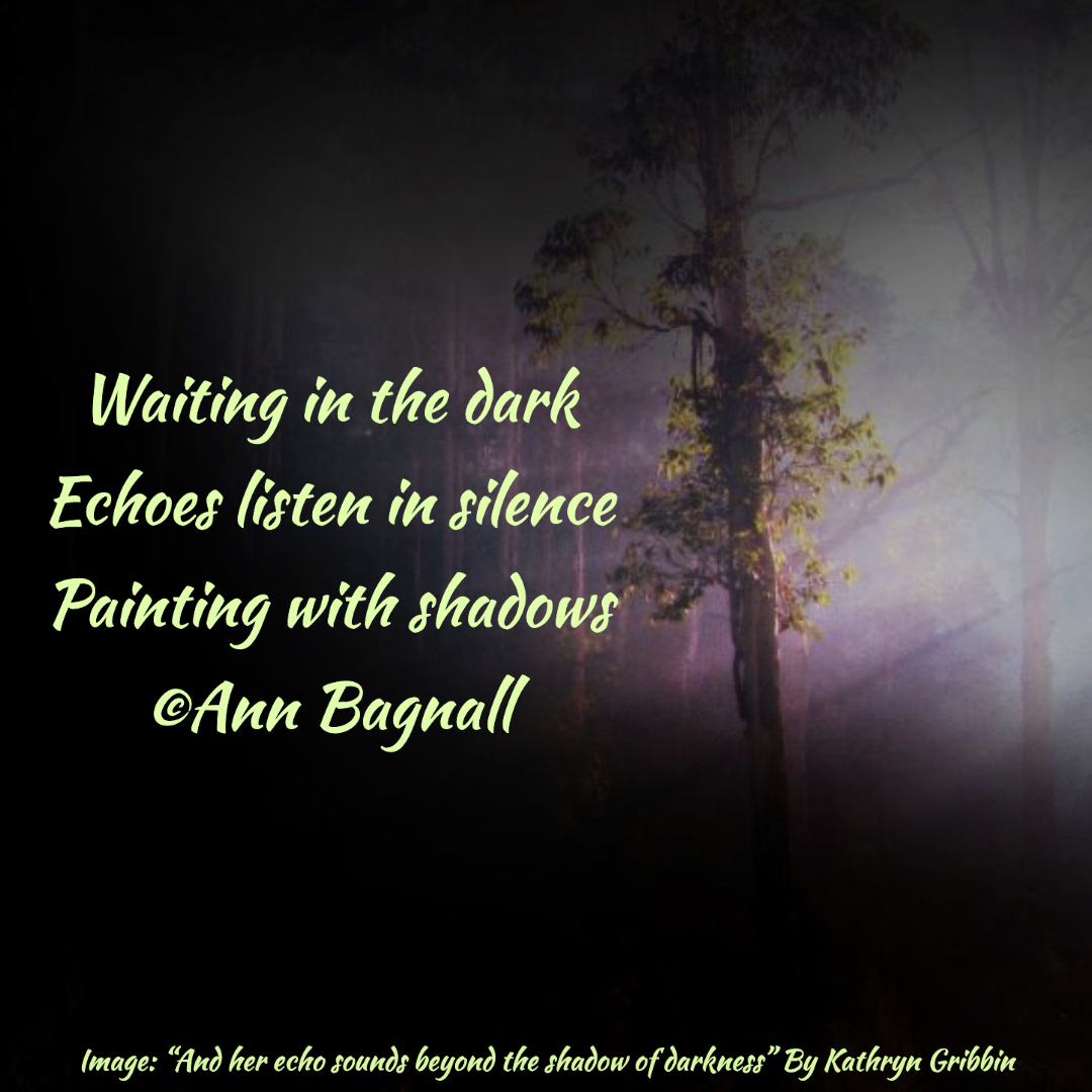 March 8, 2023February 6, 2023 Waiting in the darkEchoes listen in silencePainting with shadows© Ann Bagnall Share this: Click to email a link to a friend (Opens in new window) Email Tweet Click to print (Opens in new window) Print Like Loading... Related