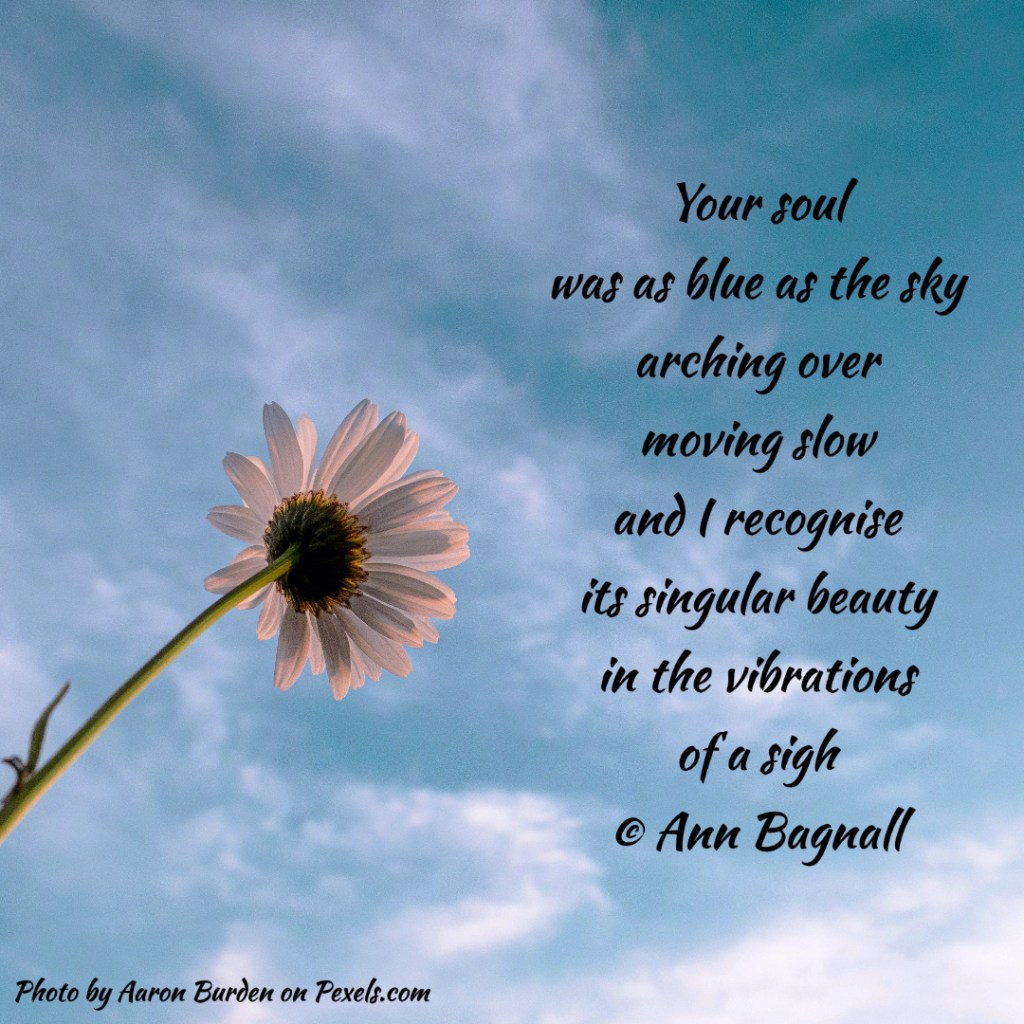 March 11, 2023February 6, 2023 Your soulwas as blue as the skyarching overmoving slowand I recogniseits singular beautyin the vibrationsof a sigh© Ann Bagnall Share this: Click to email a link to a friend (Opens in new window) Email Tweet Click to print (Opens in new window) Print Like Loading... Related
