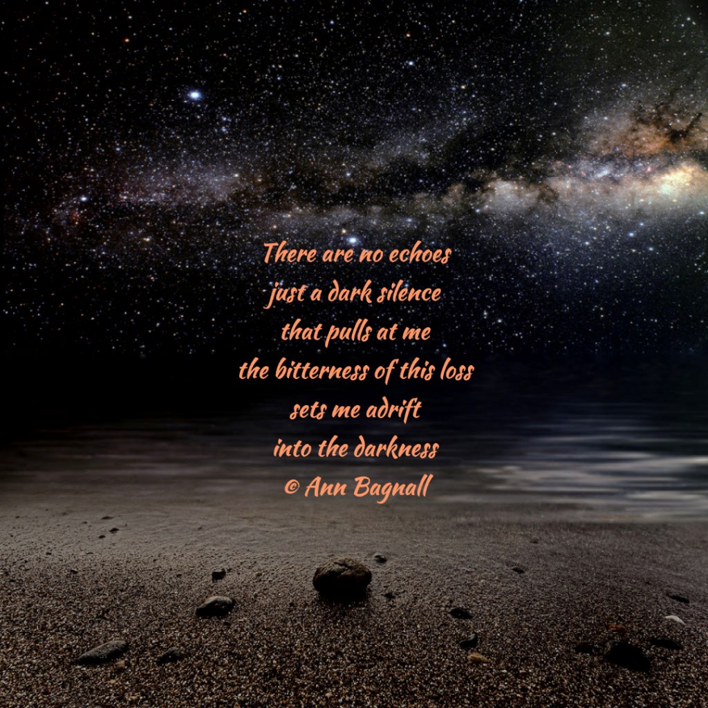 March 17, 2023February 9, 2023 There are no echoesjust a dark silencethat pulls at methe bitterness of this losssets me adriftinto the darkness© Ann Bagnall Share this: Click to email a link to a friend (Opens in new window) Email Tweet Click to print (Opens in new window) Print Like Loading... Related