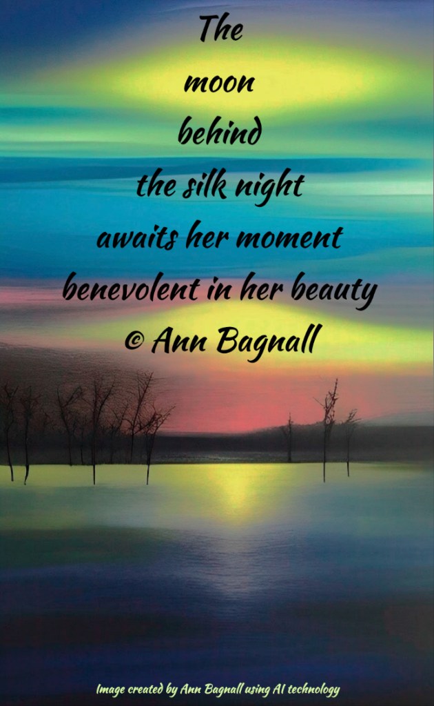 March 23, 2023February 9, 2023 Themoonbehindthe silk nightawaits her momentbenevolent in her beauty© Ann Bagnall Share this: Click to email a link to a friend (Opens in new window) Email Tweet Click to print (Opens in new window) Print Like Loading... Related