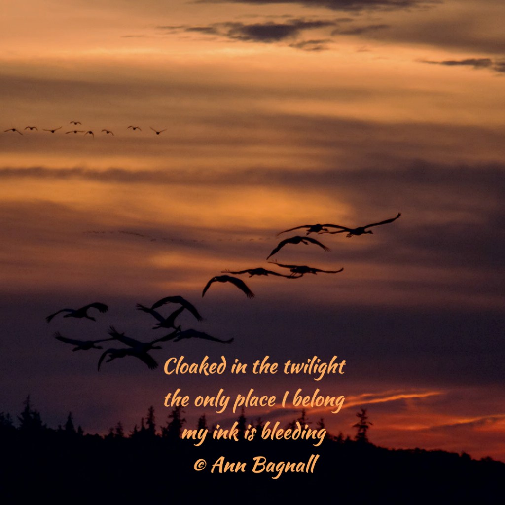 April 21, 2023February 14, 2023 Cloaked in the twilightthe only place I belongmy ink is bleeding© Ann Bagnall Share this: Email a link to a friend (Opens in new window) Email Tweet Print (Opens in new window) Print Like Loading... Related