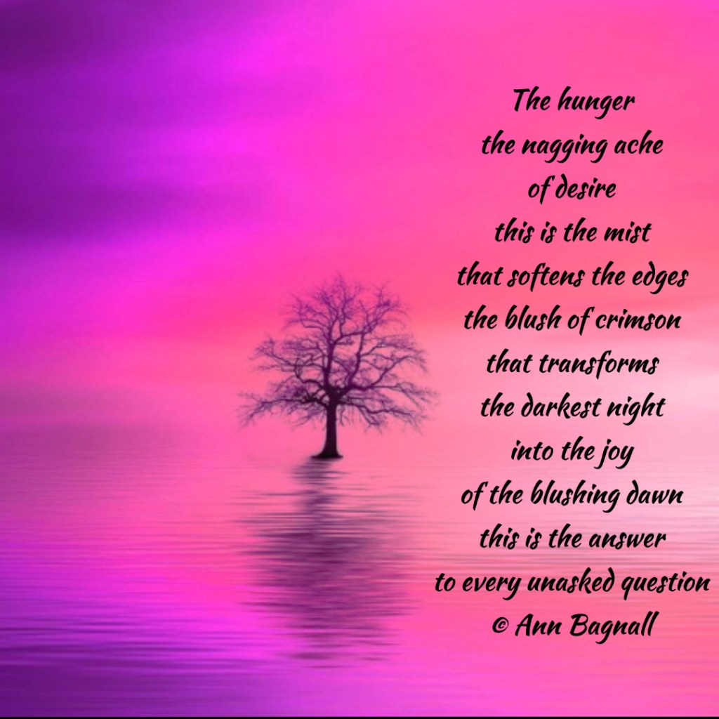 April 25, 2023March 5, 2023 The hungerthe nagging acheof desirethis is the mistthat softens the edgesthe blush of crimsonthat transformsthe darkest nightinto the joyof the blushing dawnthis is the answerto every unasked question© Ann Bagnall Share this: Click to email a link to a friend (Opens in new window) Email Tweet Click to print (Opens in new window) Print Like Loading... Related