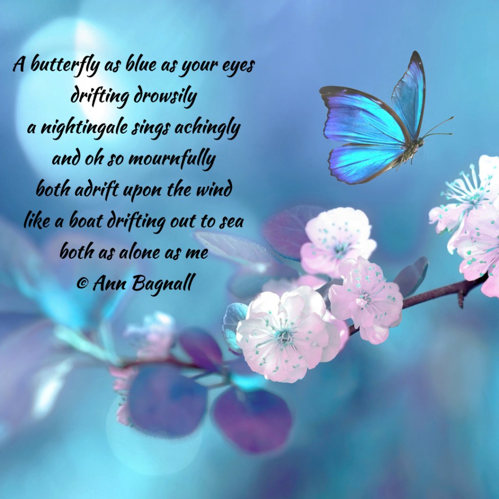 April 26, 2023March 5, 2023 A butterfly as blue as your eyesdrifting drowsilya nightingale sings achinglyand oh so mournfullyboth adrift upon the windlike a boat drifting out to seaboth as alone as me© Ann Bagnall Share this: Click to email a link to a friend (Opens in new window) Email Tweet Click to print (Opens in new window) Print Like Loading... Related