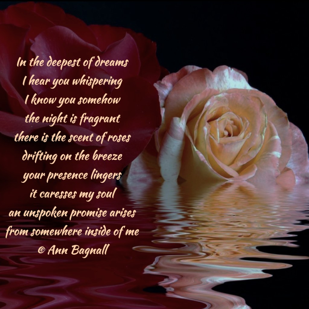 April 27, 2023March 5, 2023 In the deepest of dreamsI hear you whisperingI know you somehowthe night is fragrantthere is the scent of rosesdrifting on the breezeyour presence lingersit caresses my soulan unspoken promise arisesfrom somewhere inside of me© Ann Bagnall Share this: Click to email a link to a friend (Opens in new window) Email Tweet Click to print (Opens in new window) Print Like Loading... Related