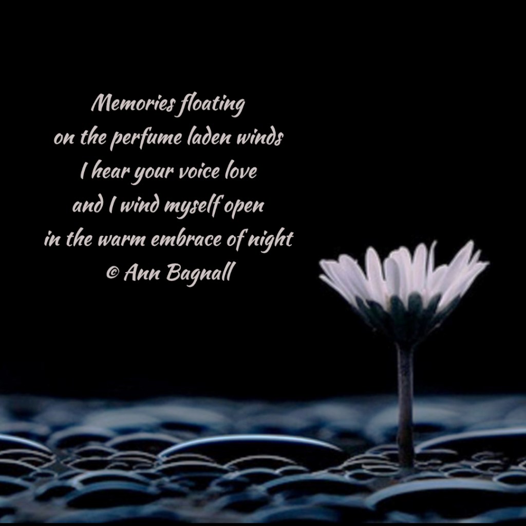 May 9, 2023March 5, 2023 Memories floatingon the perfume laden windsI hear your voice loveand I wind myself openin the warm embrace of night© Ann Bagnall Share this: Click to email a link to a friend (Opens in new window) Email Tweet Click to print (Opens in new window) Print Like Loading... Related