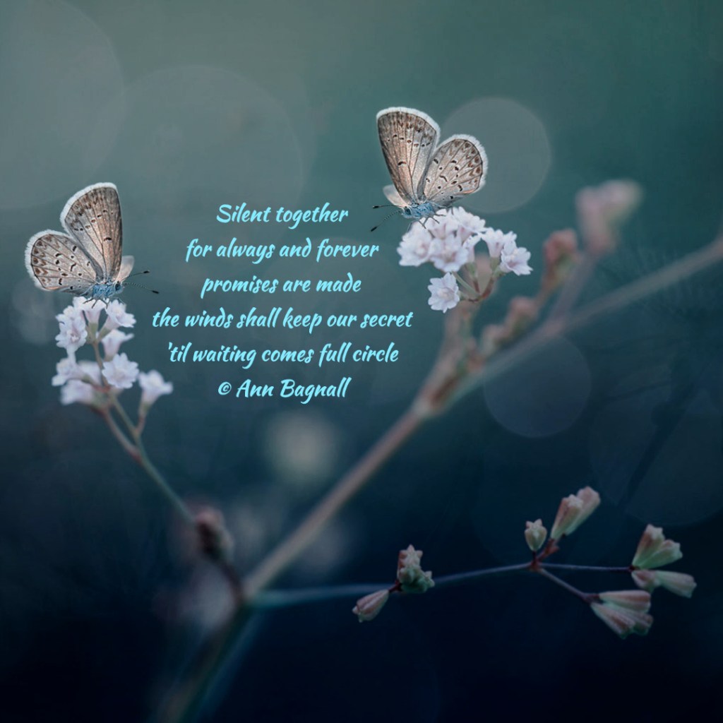May 16, 2023March 5, 2023 Silent togetherfor always and foreverpromises are madethe winds shall keep our secret’til waiting comes full circle© Ann Bagnall Share this: Click to email a link to a friend (Opens in new window) Email Tweet Click to print (Opens in new window) Print Like Loading... Related