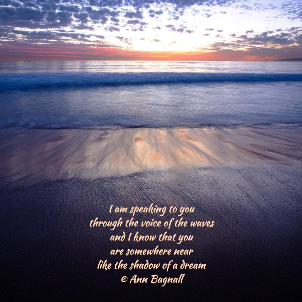 May 23, 2023March 5, 2023 I am speaking to you through the voice of the waves and I know that you are somewhere near like the shadow of a dream © Ann Bagnall Share this: Click to email a link to a friend (Opens in new window) Email Tweet Click to print (Opens in new window) Print Like Loading... Related