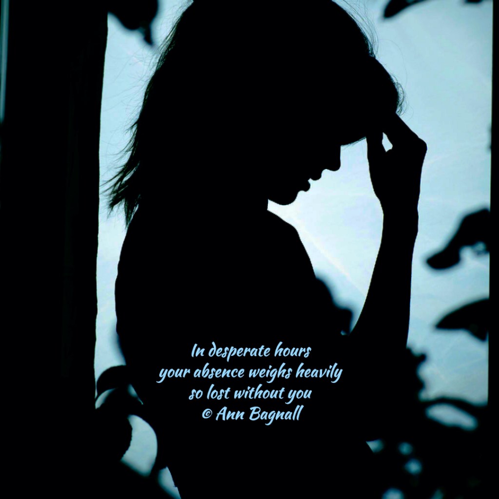 May 23, 2023June 26, 2023 In desperate hoursyour absence weighs heavilyso lost without you© Ann Bagnall Share this: Click to email a link to a friend (Opens in new window) Email Tweet Click to print (Opens in new window) Print Like Loading... Related