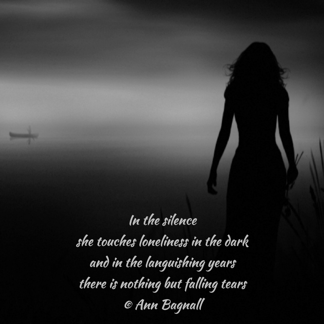 June 9, 2023April 29, 2023 In the silence she touches loneliness in the dark and in the languishing years there is nothing but falling tears © Ann Bagnall Share this: Click to email a link to a friend (Opens in new window) Email Tweet Click to print (Opens in new window) Print Like Loading... Related