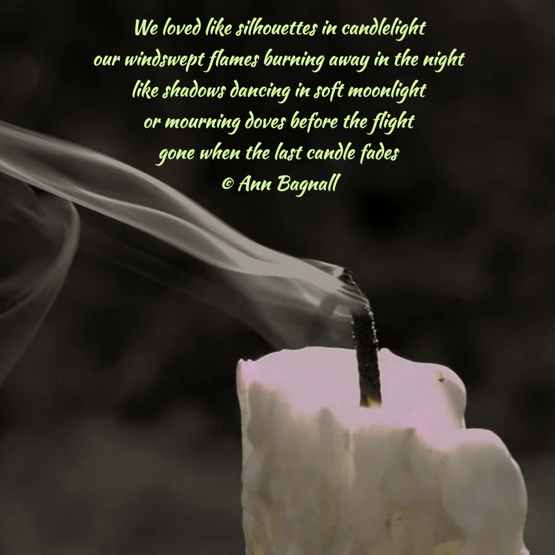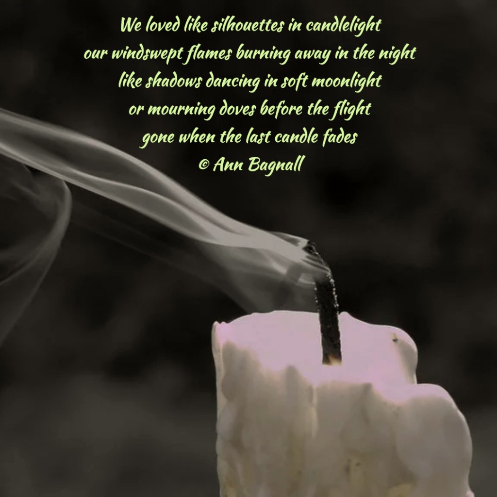 June 17, 2023May 25, 2023 We loved like silhouettes in candlelightour windswept flames burning away in the nightlike shadows dancing in soft moonlightor mourning doves before the flightgone when the last candle fades© Ann Bagnall Share this: Click to email a link to a friend (Opens in new window) Email Tweet Click to print (Opens in new window) Print Like Loading... Related