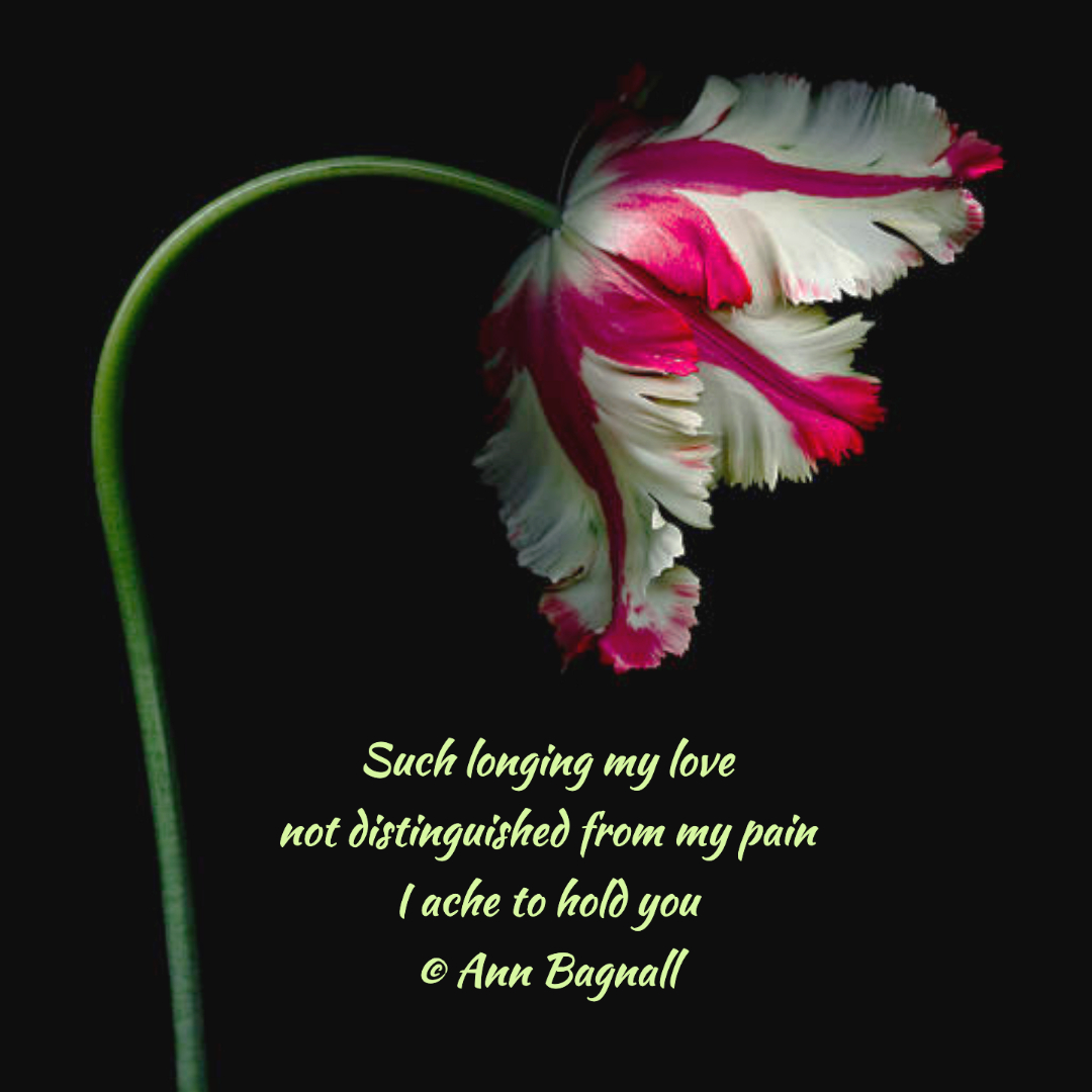 July 8, 2023June 17, 2023 Such longing my lovenot distinguished from my painI ache to hold you© Ann Bagnall Share this: Email a link to a friend (Opens in new window) Email Tweet Print (Opens in new window) Print Like Loading... Related