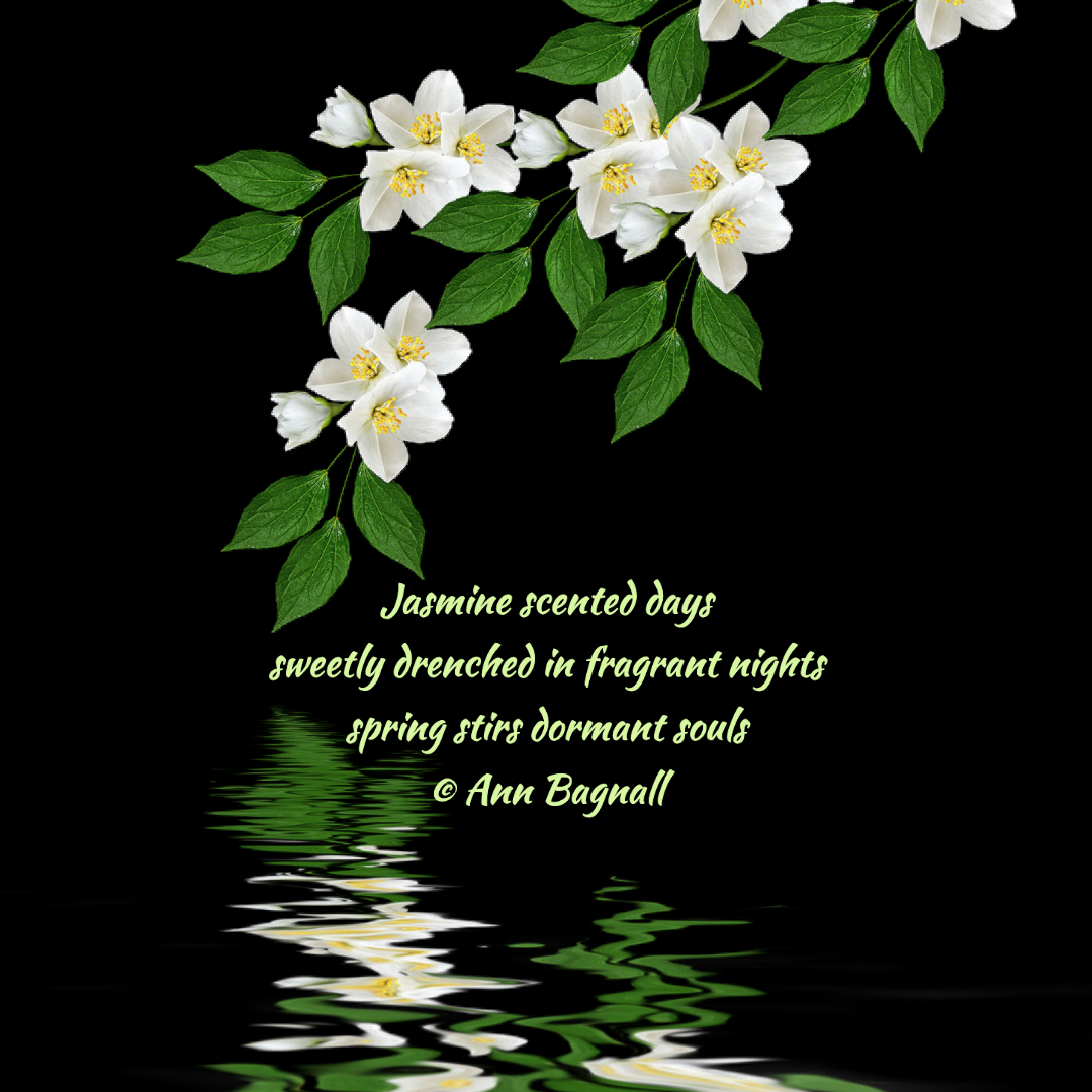 July 15, 2023June 17, 2023 Jasmine scented dayssweetly drenched in fragrant nightsspring stirs dormant souls© Ann Bagnall Share this: Click to email a link to a friend (Opens in new window) Email Tweet Click to print (Opens in new window) Print Like Loading... Related