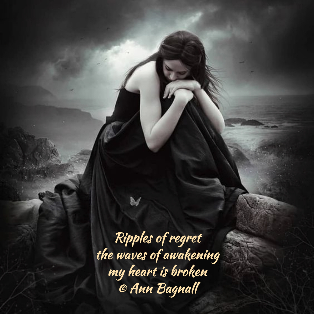 July 16, 2023June 17, 2023 Ripples of regretthe waves of awakeningmy heart is broken© Ann Bagnall Share this: Click to email a link to a friend (Opens in new window) Email Tweet Click to print (Opens in new window) Print Like Loading... Related
