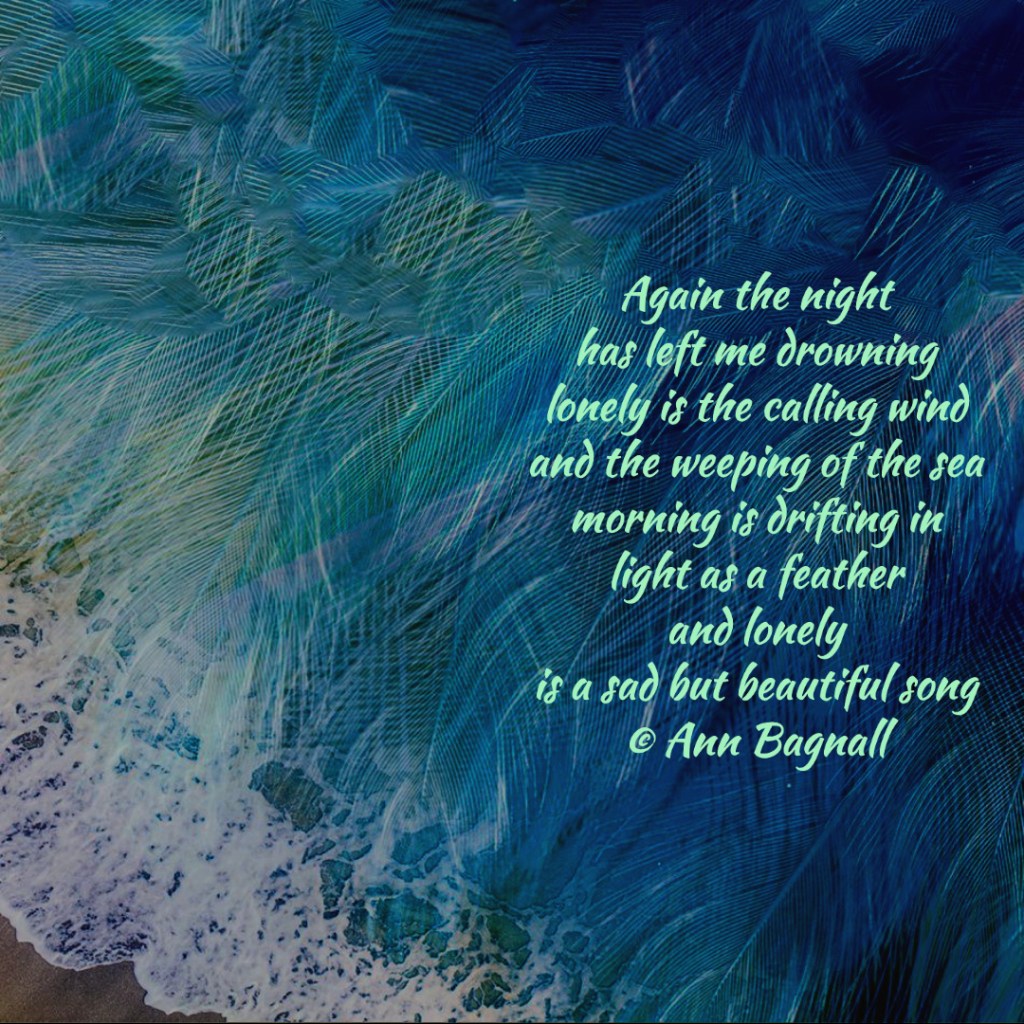 July 20, 2023June 17, 2023 Again the nighthas left me drowninglonely is the calling windand the weeping of the seamorning is drifting inlight as a featherand lonelyis a sad but beautiful song© Ann Bagnall Share this: Click to email a link to a friend (Opens in new window) Email Tweet Click to print (Opens in new window) Print Like Loading... Related