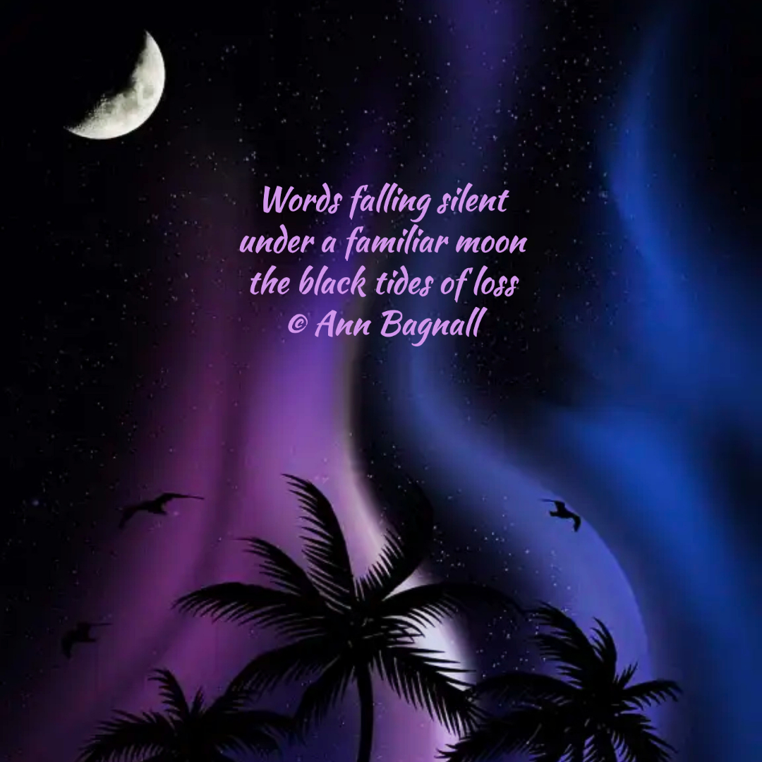 July 21, 2023 Words falling silentunder a familiar moonthe black tides of loss© Ann Bagnall Share this: Click to email a link to a friend (Opens in new window) Email Tweet Click to print (Opens in new window) Print Like Loading... Related