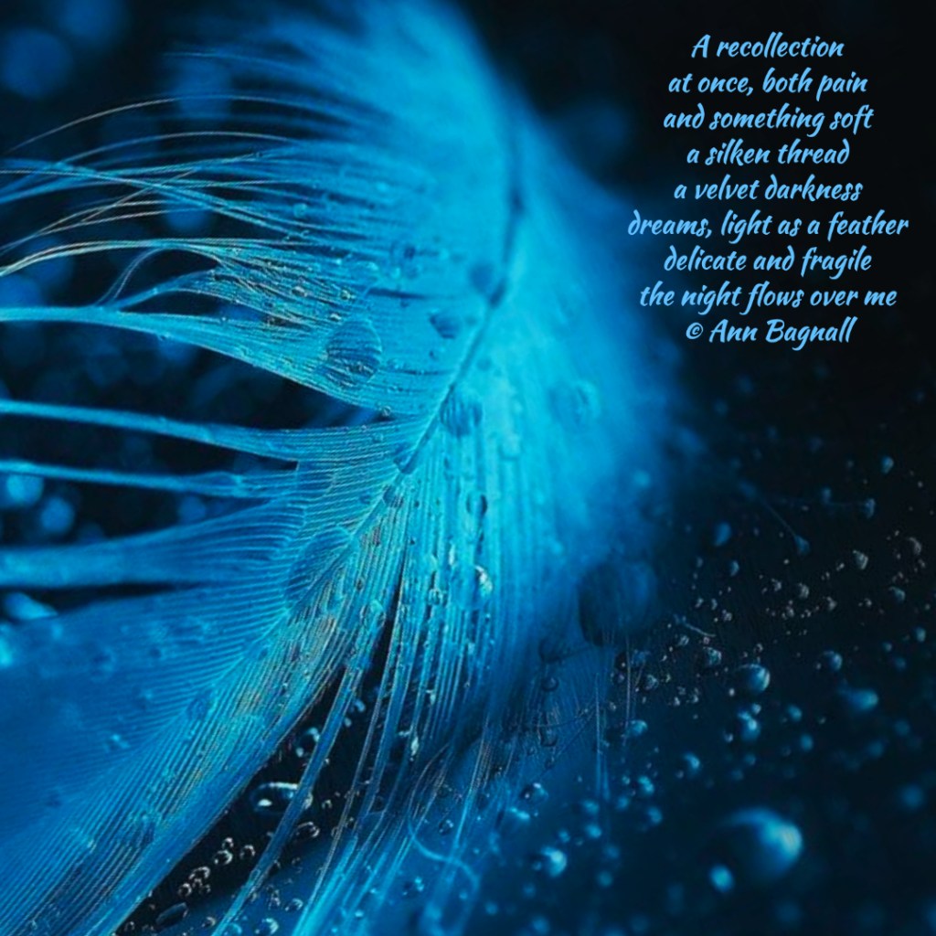 July 29, 2023June 17, 2023 A recollectionat once, both painand something softa silken threada velvet darknessdreams, light as a featherdelicate and fragilethe night flows over me© Ann Bagnall Share this: Click to email a link to a friend (Opens in new window) Email Tweet Click to print (Opens in new window) Print Like Loading... Related