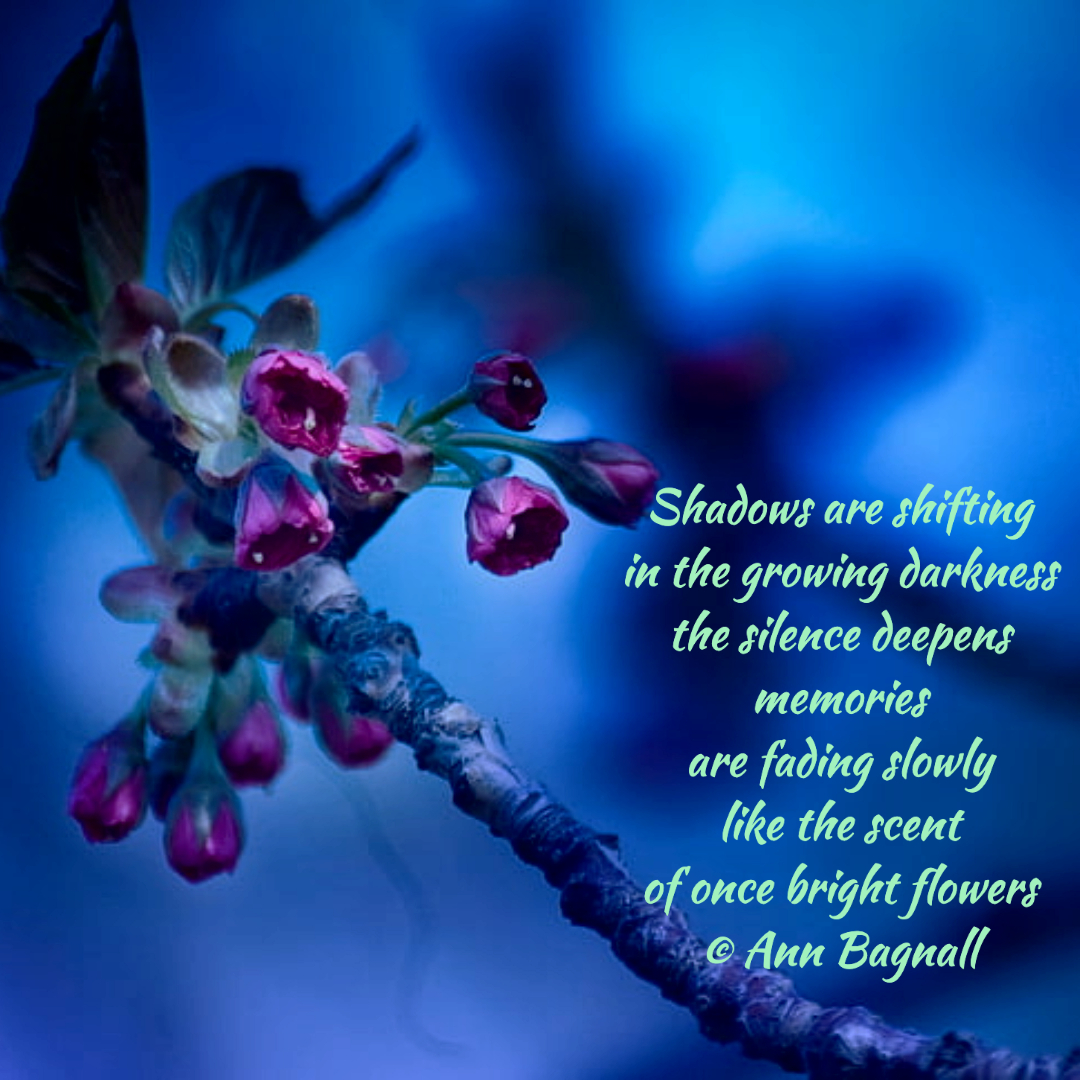 August 7, 2023August 1, 2023 Shadows are shiftingin the growing darknessthe silence deepensmemoriesare fading slowlylike the scentof once bright flowers© Ann Bagnall Share this: Click to email a link to a friend (Opens in new window) Email Tweet Click to print (Opens in new window) Print Like Loading... Related
