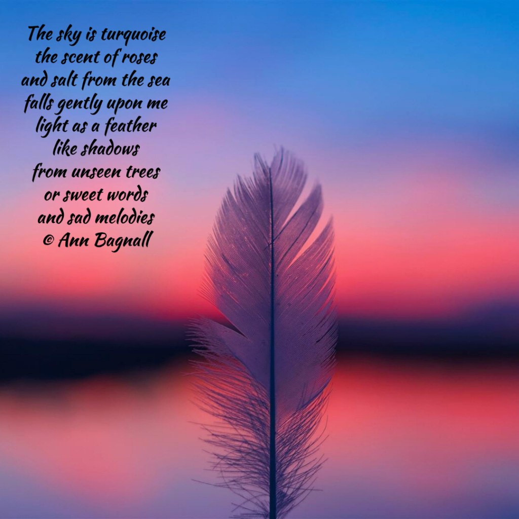August 11, 2023August 1, 2023 The sky is turquoisethe scent of rosesand salt from the seafalls gently upon melight as a featherlike shadowsfrom unseen treesor sweet wordsand sad melodies© Ann Bagnall Share this: Click to email a link to a friend (Opens in new window) Email Tweet Click to print (Opens in new window) Print Like Loading... Related