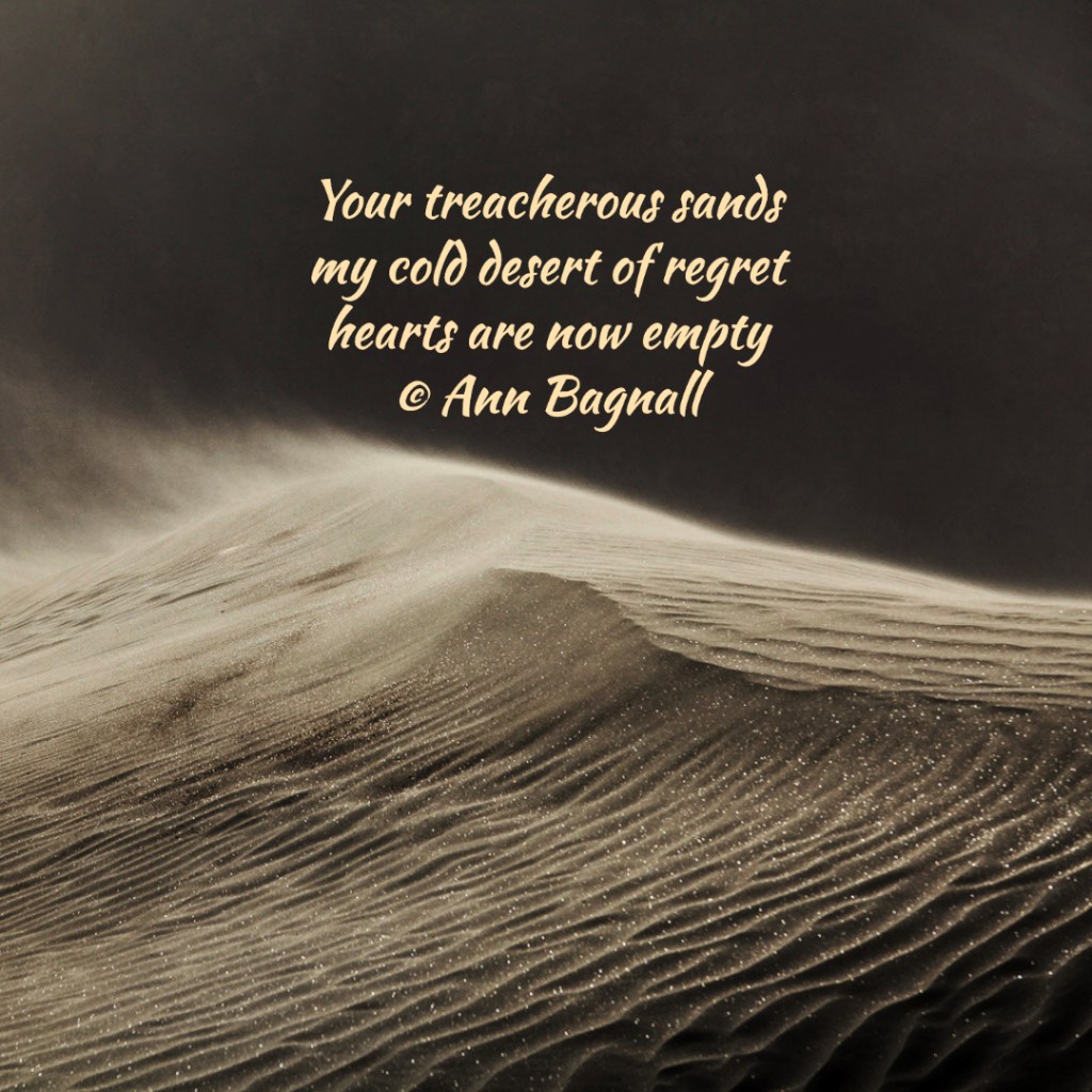 August 14, 2023August 6, 2023 Your treacherous sandsmy cold desert of regrethearts are now empty© Ann Bagnall Share this: Click to email a link to a friend (Opens in new window) Email Tweet Click to print (Opens in new window) Print Like Loading... Related