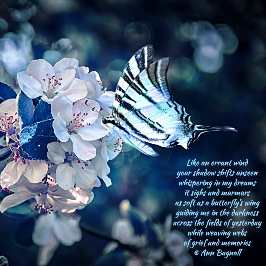 August 17, 2023August 17, 2023 Like an errant windyour shadow shifts unseenwhispering in my dreamsit sighs and murmursas soft as a butterfly’s wingguiding me in the darknessacross the fields of yesterdaywhile weaving websof grief and memories© Ann Bagnall Share this: Click to email a link to a friend (Opens in new window) Email Tweet Click to print (Opens in new window) Print Like Loading... Related