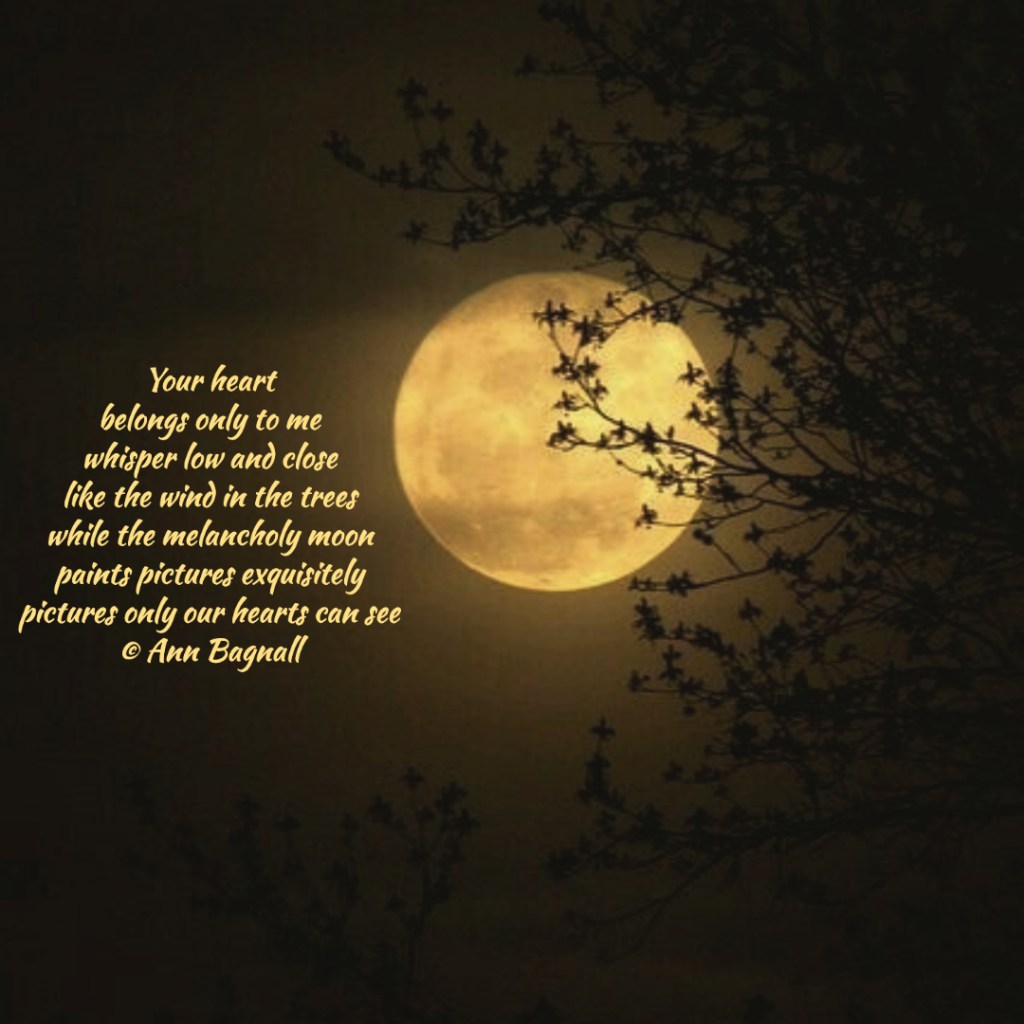 August 18, 2023August 19, 2023 Your heartbelongs only to mewhisper low and closelike the wind in the treeswhile the melancholy moonpaints pictures exquisitelypictures only our hearts can see© Ann Bagnall Share this: Click to email a link to a friend (Opens in new window) Email Tweet Click to print (Opens in new window) Print Like Loading... Related