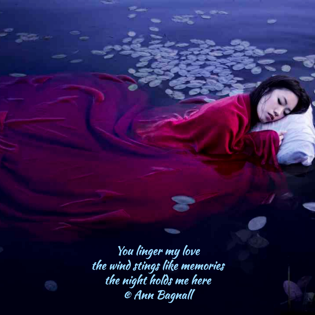 August 19, 2023August 17, 2023 You linger my lovethe wind stings like memoriesthe night holds me here© Ann Bagnall Share this: Email a link to a friend (Opens in new window) Email Tweet Print (Opens in new window) Print Like Loading... Related