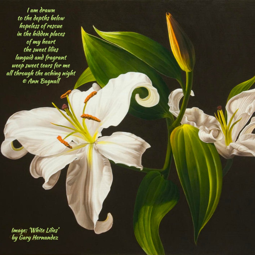 September 12, 2023September 4, 2023 I am drawn to the depths belowhopeless of rescuein the hidden places of my heartthe sweet lilies, languid and fragrantweep sweet tears for meall through the aching night© Ann Bagnall Share this: Click to email a link to a friend (Opens in new window) Email Tweet Click to print (Opens in new window) Print Like Loading... Related